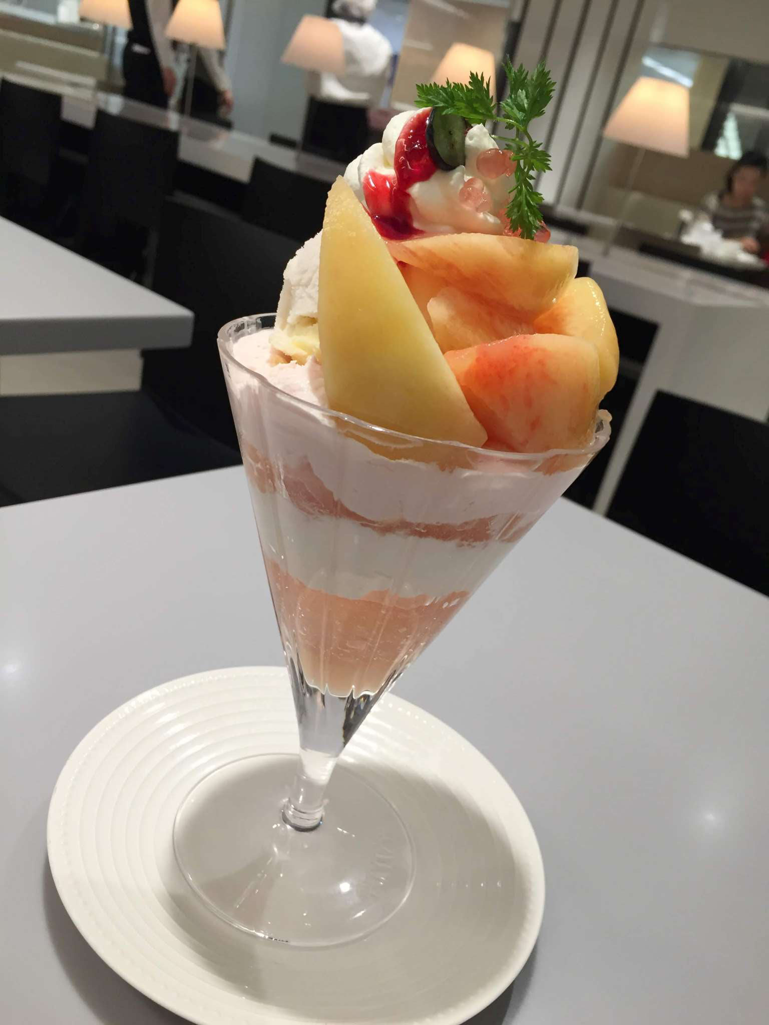 出了麵店轉兩個彎就是高野水果廳(タカノフルーツパーラー 地下鉄ビル店),或許是再不到一小時就要關門了,居然沒什麼人。看到外面的海報,季節水果已然是水蜜桃⋯在「沖繩芒果水蜜桃聖代」與純粹的「水蜜桃聖代」之間掙扎的結果,選了後者,來了非常高雅的一杯。